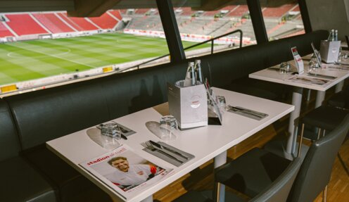 Enjoy a stylish atmosphere and a view of the legendary Cannstatter Kurve. This area in the Untertürkheimer Kurve features an elegant ambience and an impressive outdoor terrace with a view of the VfB Club Center. Large glass fronts create a friendly atmosphere and emphasize the open, communicative character of this area.